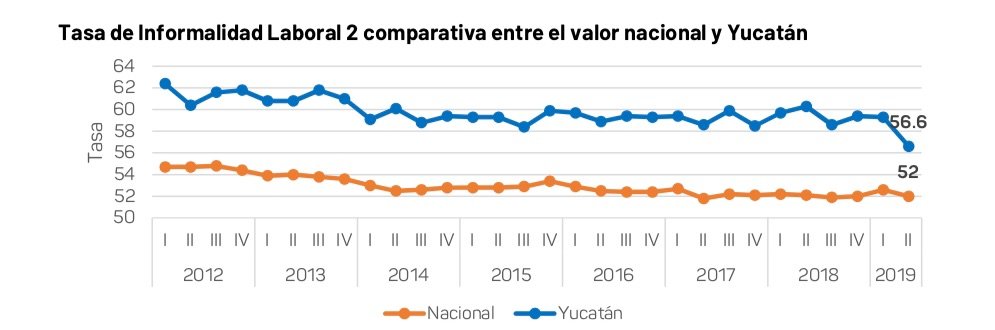 De acuerdo con la encuesta, realizada por el Instituto Nacional de Estadística y Geografía (Inegi), en el segundo trimestre de este año, Yucatán registró una tasa de informalidad laboral con un valor de 56.6, la más baja registrada en su historia. Lo anterior representó un decremento del indicador de -3.7 puntos respecto al mismo período de 2018.