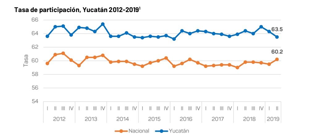 -Ese mismo período, Yucatán reportó una participación o población económicamente activa en el mercado laboral del 63.5%, por lo que se ubicó en la posición 5 con mayor proporción a nivel nacional.