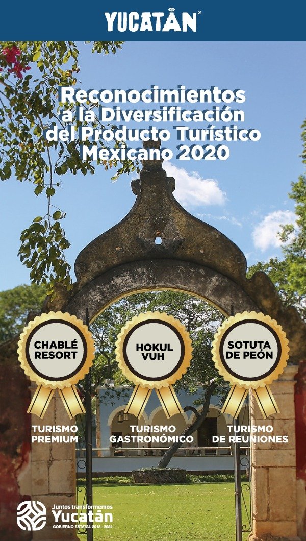 Este mérito es dado por la Secretaría Federal de Turismo (Sectur) y la entidad salió avante en tres categorías: Turismo Gastronómico, con Hokol Vuh, un viaje culinario maya; de Reuniones, con el Tour Atardecer de Hacienda Hotel Sotuta de Peón, y Premium, con Resort Chablé Yucatán.