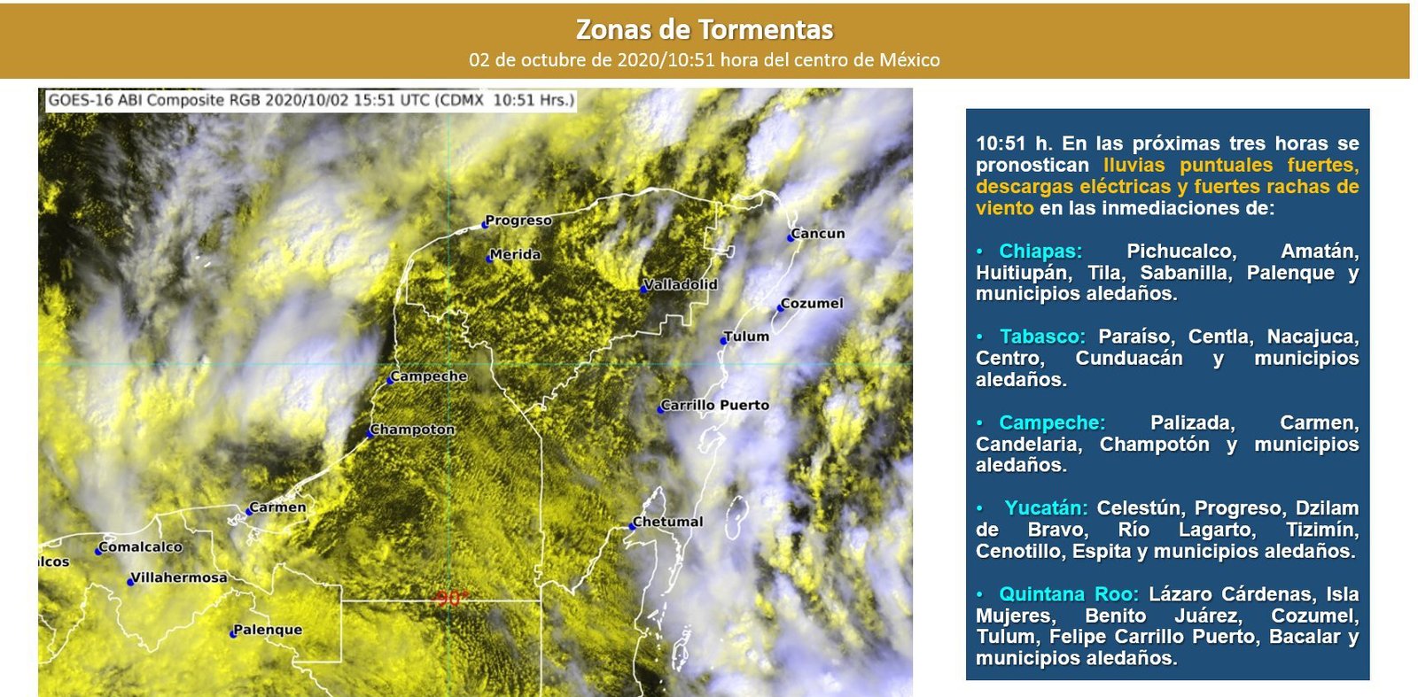 La dependencia federal indicó que, los modelos matemáticos y previsiones establecen que este sistema se localiza a 355 km al sureste de Cozumel, Q. Roo y evolucionará con un derrotero nor-noroeste y tendrá una afectación en los próximos 5 días con un recorrido por mar y tierra en la costa norte de Quintana Roo y posteriormente hacia el litoral yucateco, por lo que es preciso extremar las medidas de seguridad marítima para ambos estados.