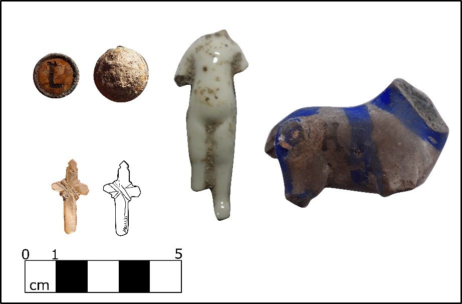Otros elementos encontrados, son restos faunísticos permitirá conocer aspecto de los hábitos de consumo o preparación de alimentos; figurillas antropomorfas o animales, empleados como juguetes; botones de metal y una cruz, al parecer, elaborado en concha.