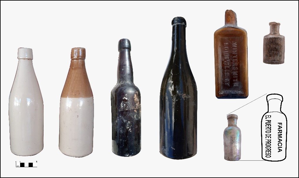 En el caso de las botellas sinusoidales encontradas se ubicaron algunas de la marca H. Kennedy 64 Barrowfield Potteries Glasgow, de fábrica inglesa que funcionó entre 1866 hasta 1929; restos de vidrio desde finales del siglo XIX hasta las primeras décadas del XX.