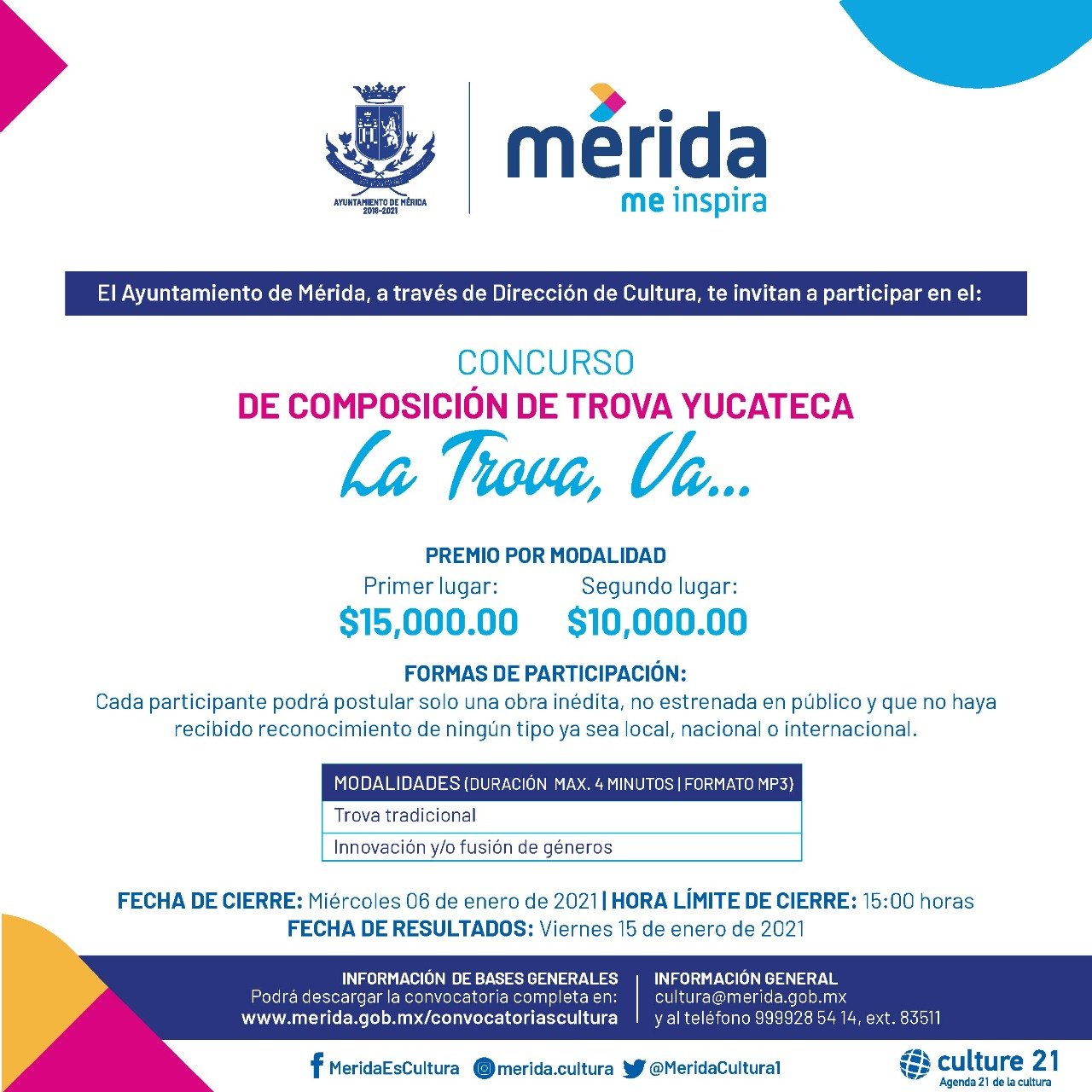 La invitación al “Concurso de Composición de Trova Yucateca: La Trova, Va…” es a todos los compositores del municipio de Mérida, sin límite de edad y con residencia permanente en la ciudad.