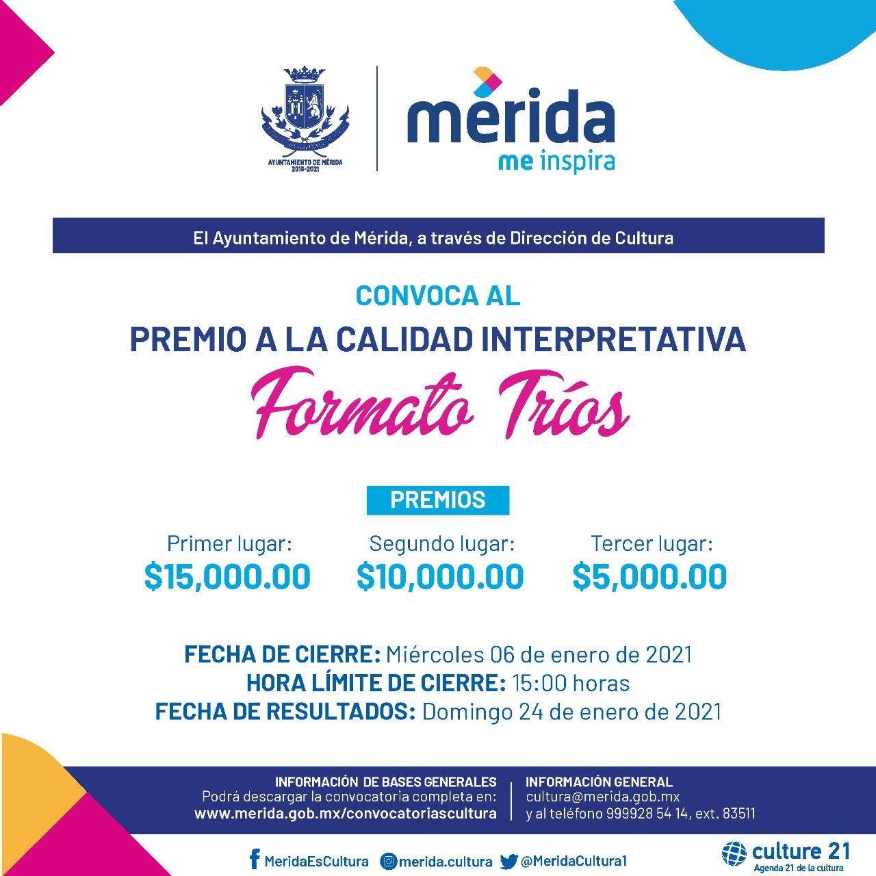En el caso del Premio a la Calidad Interpretativa, la convocatoria está dirigida a agrupaciones de tríos que interpreten trova yucateca y se apeguen a los estándares musicales de la trova tradicional en cuanto a forma, estructura y género (danza, clave, bambuco, bolero, evocación maya, etc.)