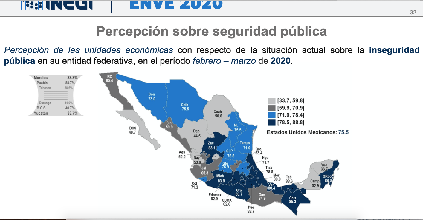 Al darse a conocer la Encuesta Nacional de Victimización de Empresas (ENVE) 2020, realizado por el Instituto Nacional de Estadística y Geografía (Inegi) destaca que, durante 2019 se generaron 3.9 millones de delitos asociados a 1.5 millones de unidades económicas víctima, esto representa una tasa de concentración de 2.6 delitos por unidad económica víctima.