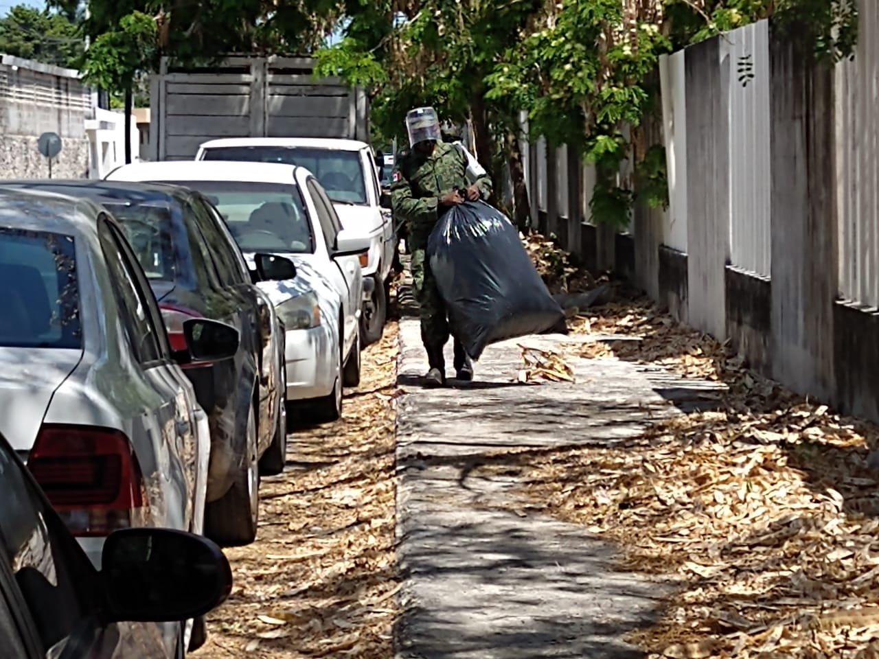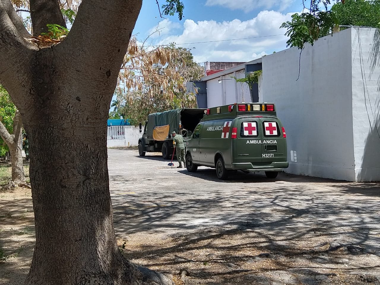 En el Centro de Convenciones de la Cámara de Comercio de Mérida (calle 31 por 34 de la colonia García Ginerés) una treintena de elementos de la Sedena realizaron este día limpieza, control sanitario y recoja de basura en el perímetro del punto de vacunación.