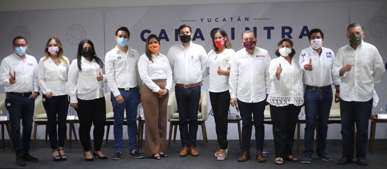 Ante los candidatos al Congreso yucateco, del PAN, Víctor Hugo Lozano Poveda; PRI, Karla Franco Blanco; PT, Zazil Quintal Patrón; PVEM, Jonatan Basora Huchim; MC, Nayelli Hernández Crespo; Morena, Jorge Sánchez Reyes; Nueva Alianza, Addy Pérez Echeverría, PES; Michel Aguiar Hernández, RSP; Janett Hipó Marqueda y Fuerza por México; Rashid Azar Herrera, el dirigente empresarial apuntó que el reto de los yucatecos el día de la elección es ser ejemplo de la participación ciudadana.