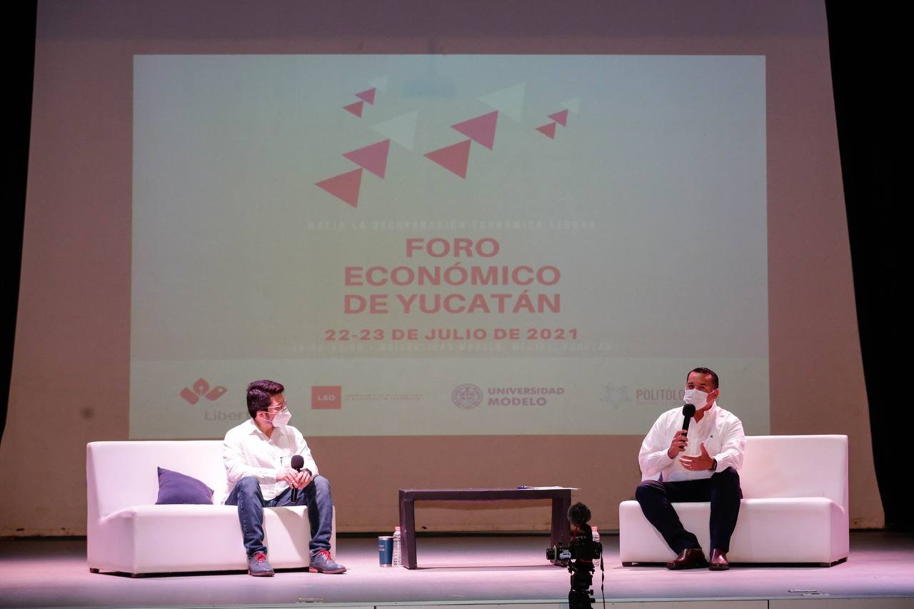 A invitación del Laboratorio de Políticas para la Seguridad y el Desarrollo, el Concejal asistió al foro, realizado en el teatro del Centro Cultural de la Universidad Modelo, donde en formato de entrevista dialogó con el politólogo Juan Pablo Galicia sobre las aportaciones municipales para fortalecer el panorama económico.