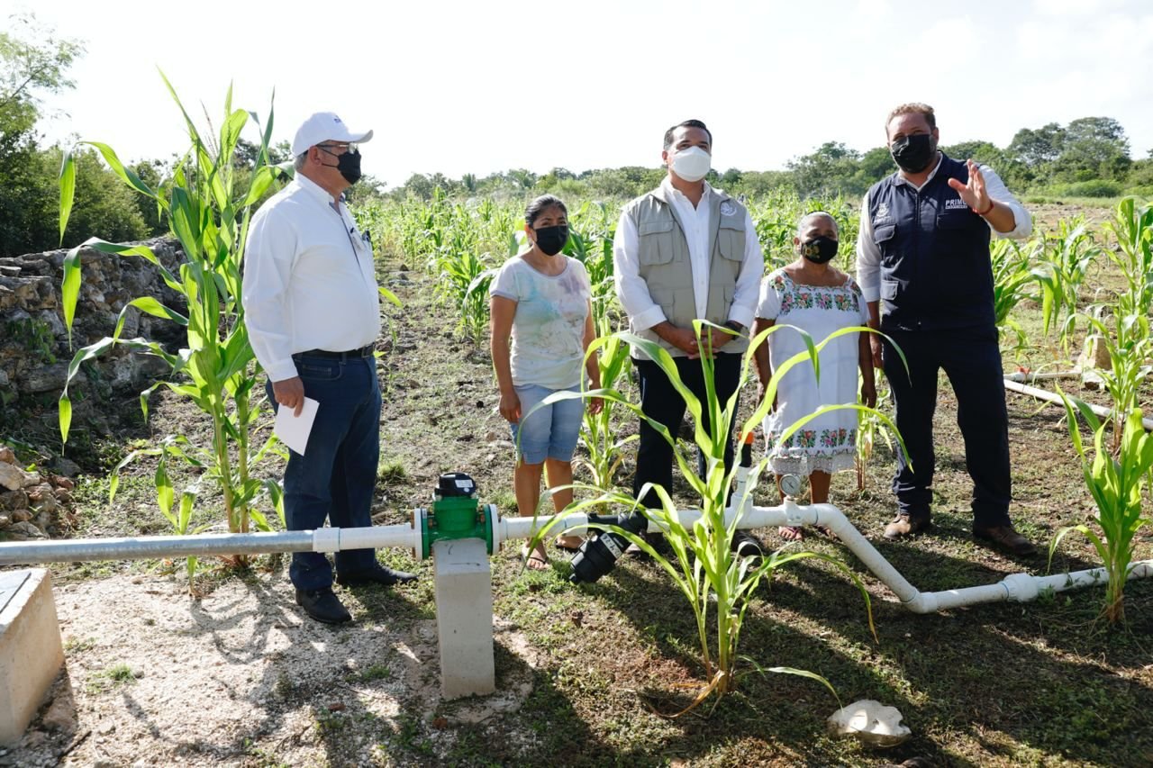 Acompañado de los directores de Desarrollo Social y Obras Públicas, José Luis Martínez Semerena y David Loría Magdub, respectivamente, Barrera Concha llegó a la parcela de la señora Teresa Cimé Tziu, beneficiaria del sistema de riego, ubicada en la calle 25 por 20 de San Ignacio Tesip.