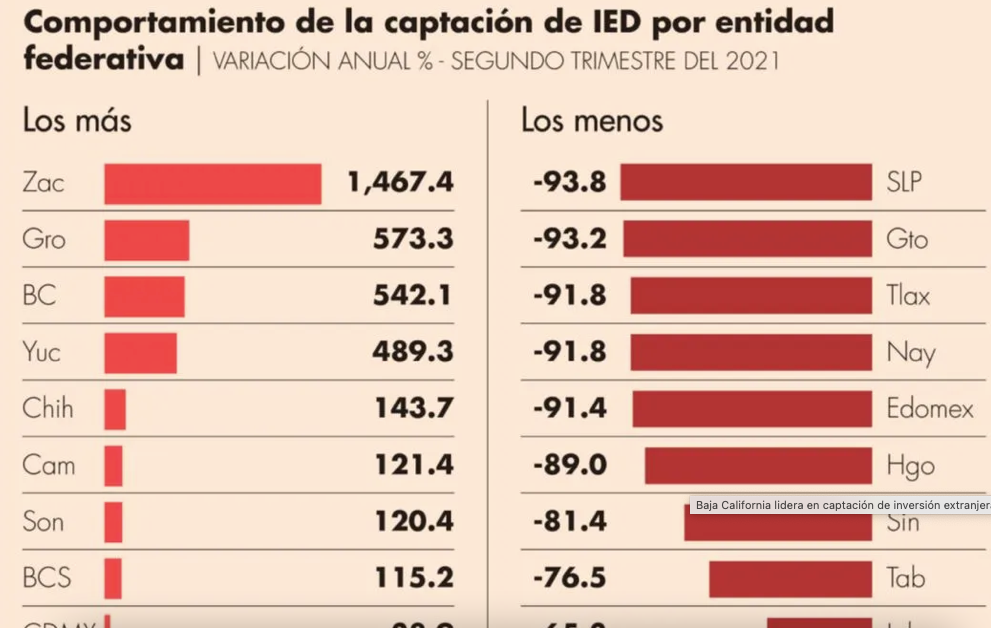 Las cifras emitidas por la Secretaría de Economía indican que, en lo que va de 2021, nuestro estado ha capturado poco más de 40 millones de dólares en IED. Los datos ofrecidos por la institución indican que, Baja California fue la entidad que alcanzó el primer sitio con mil 321 millones de dólares de capital extranjero, además, este último monto representó un crecimiento de 542.1% a tasa anual.
