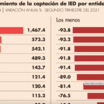 En tanto que, los estados que resultaron con menor captación de IED fueron: San Luis Potosí, con un decremento del 93.8 por ciento, Guanajuato con menos 93.2 y Tlaxcala, con menos 91.8 por ciento, se estima que México recibió en Inversión Extranjera Directa en el segundo trimestre de 2021 un monto de 5 mil 955 millones de dólares.