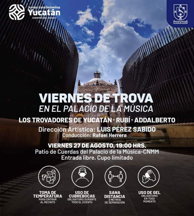 “Viernes de trova” continuará los próximos 17 y 24 de septiembre, 22 y 29 de octubre, 19 y 26 de noviembre, así como 3, 10 y 17 de diciembre, fechas en las que se sumarán Emma Alcocer, Javier Alcalá, Jesús Armando y Maricarmen Pérez. La entrada es gratuita y con los protocolos sanitarios pertinentes.