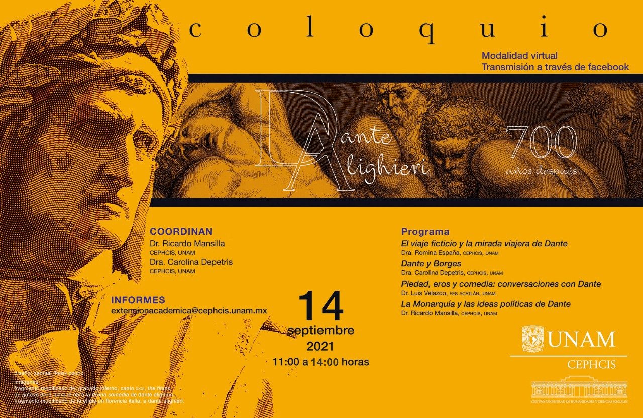 Por tan importante acontecimiento, el CEPHCIS de la UNAM también se suma a las conmemoraciones que a nivel mundial se estarán realizando en torno a la vida y obra del gran Dante Alighieri realizando el Coloquio Dante Alighieri 700 años después, que bajo la coordinación de los doctores Ricardo Mansilla y Carolina Depetris, investigadores del Centro, tiene como objetivo brindar una visión interdisciplinaria de la vida de este gran poeta y sus vínculos y trascendencia en la actualidad.