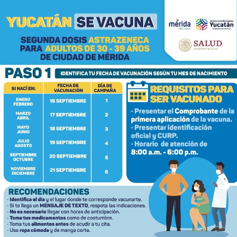 Mérida, Yuc, 14 de sept.- La aplicación de la segunda dosis de la vacuna contra el Coronavirus a las personas de entre 30 y 39 años en Mérida se realizará del jueves 16 al martes 21 de septiembre, proceso que se realizará en coordinación con el Gobierno del Estado, el Ayuntamiento de Mérida y la Secretaría de Bienestar, informó la Secretaría de Salud de Yucatán (SSY).