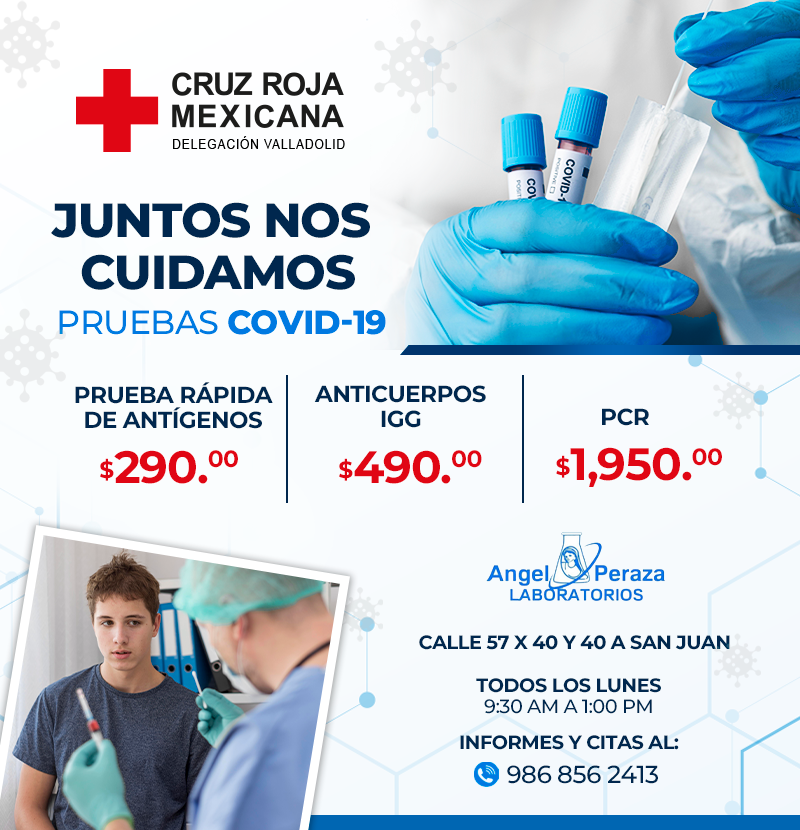 Mérida, Yuc, 01 de oct.- A partir del próximo lunes 4 de octubre se ofrecerá en el Centro Anticanceroso y las Delegaciones Progreso y Valladolid de Cruz Roja Mexicana la posibilidad de realizarse las pruebas para detectar el Covid-19 a bajo costo, anunció la Coordinadora Estatal de Damas Voluntarias, María del Rosario Alam de Gené.
