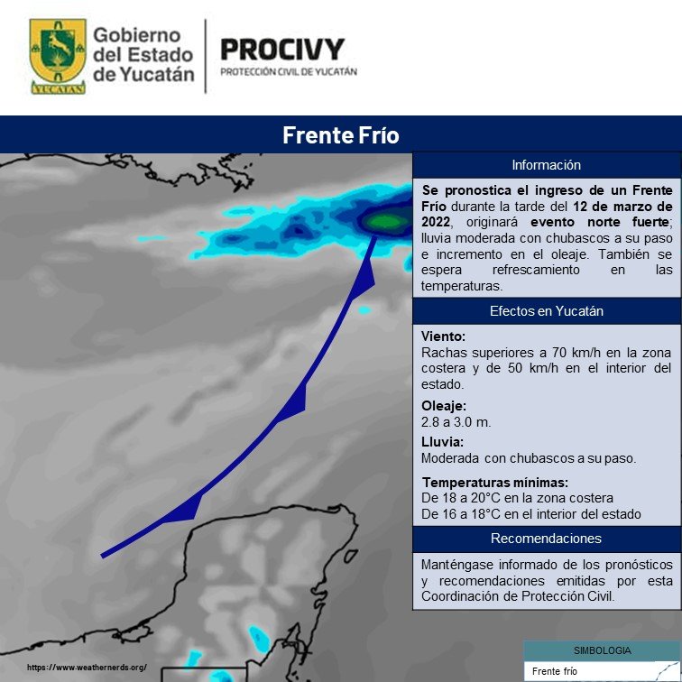 Mérida, 11 de marzo.- La Coordinación Estatal de Protección Civil (Procivy) informó de la aproximación de otro frente frío a partir del próximo sábado, con rachas de vientos de hasta 70 km/h en la zona costera, condiciones que permitirán atenuar la sensación térmica del calor y las elevadas temperaturas de los últimos días.