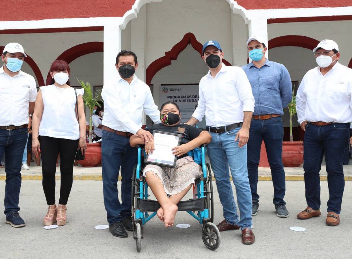 Al continuar con la distribución de apoyos a los habitantes de Dzemul, Vila Dosal conoció a Catalina Pat Cantún, una de las beneficiarias con la entrega de aparatos de movilidad, por lo que recibió su silla de ruedas para poder trasladarse con dignidad y ser autónoma.