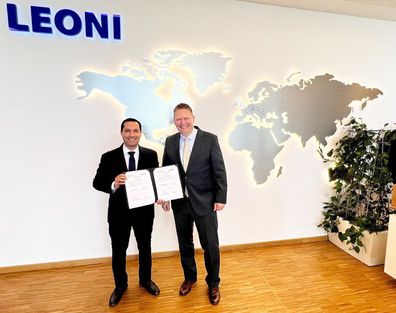 Luego de una visita y recorrido por las instalaciones de Leoni en dicha ciudad, Vila Dosal y el vicepresidente senior de recursos humanos de Leoni, Michael Detert, signaron el acuerdo que reafirma los lazos de colaboración con esta empresa que es un proveedor global de productos, soluciones y servicios para la gestión de datos y energía en el sector de la automoción y otras industrias.