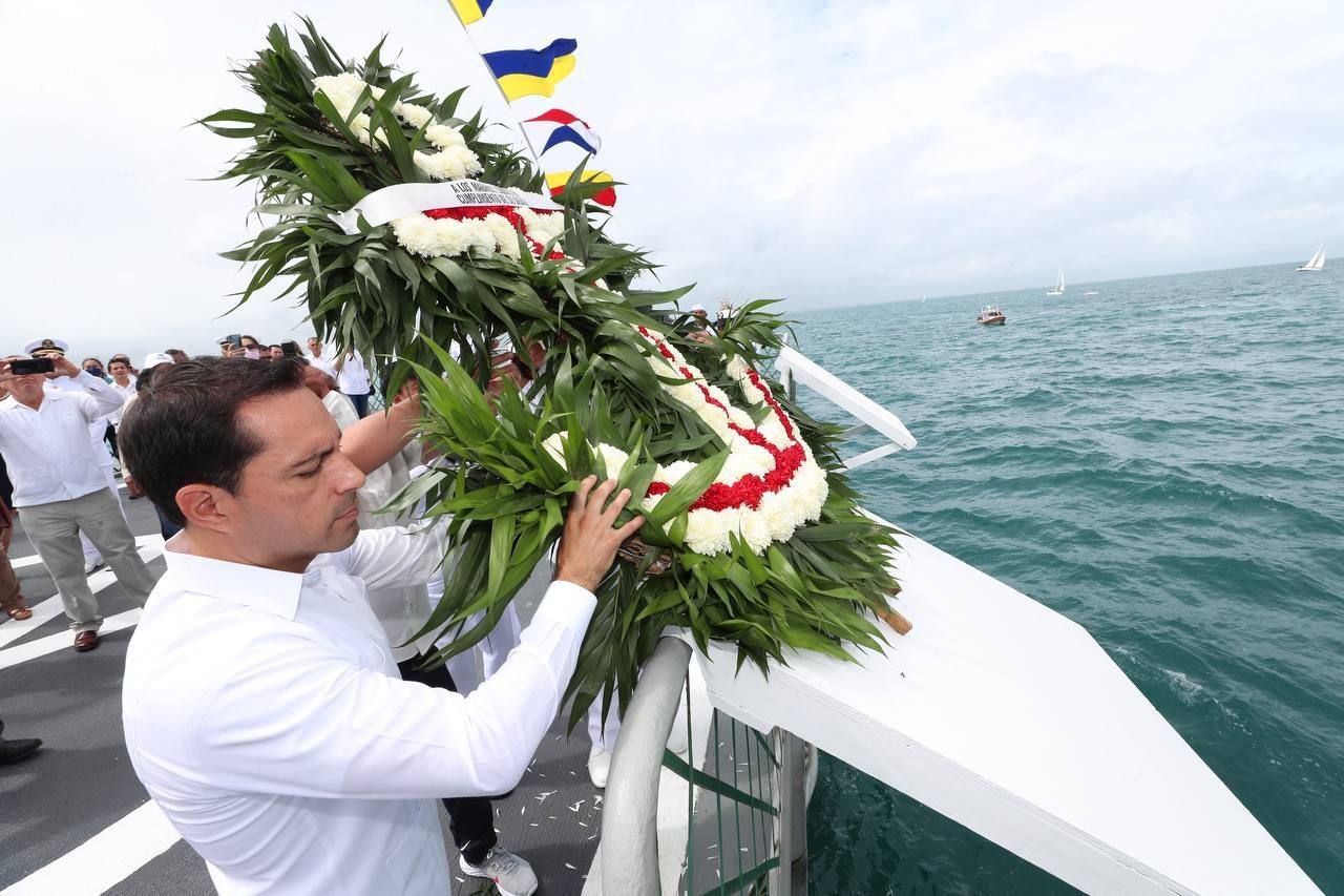 A bordo del buque insignia “Veracruz”, el Gobernador, junto con el vicealmirante Raymundo Pedro Morales Ángeles, depositó una ofrenda floral en altamar en honor a los marinos caídos en el cumplimiento de su deber.