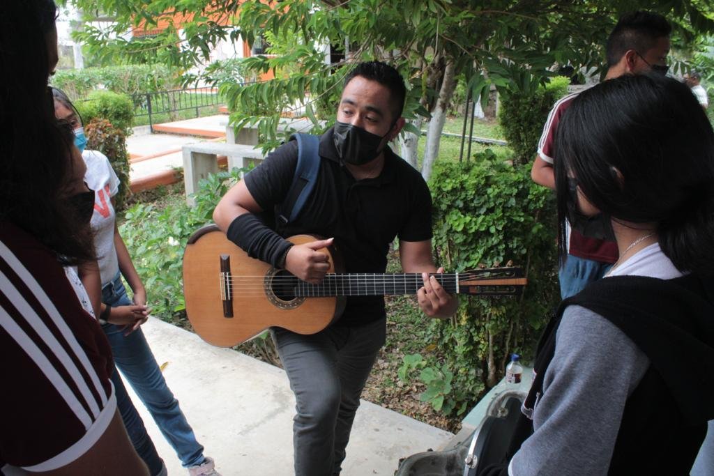El guitarrista, quien está por graduarse de la Licenciatura en Música en la ESAY, explicó al alumnado el significado de cada obra del repertorio que presentó, con la idea de salir de lo convencional y permitirles saber que hay otras composiciones ambiguas, bizarras, extrañas, que generan curiosidad e intriga.