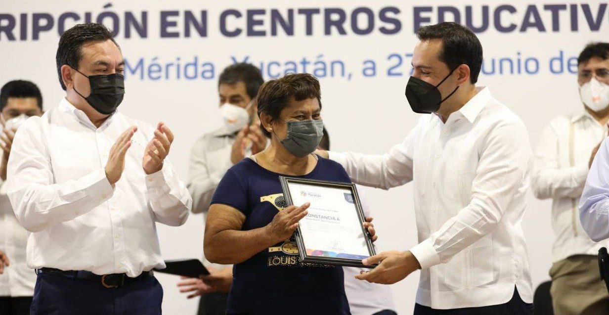 Mérida, Yuc 27 de junio.- En un acto de justicia laboral, como reconocimiento al esfuerzo y la dedicación del personal de apoyo o asistencia a la educación, que por hasta 12 años, ha brindado sus servicios en planteles de nivel básico bajo contrato, el Gobernador Mauricio Vila Dosal entregó 399 plazas, con lo que se les brinda mayor certeza, estabilidad y mejores condiciones, a ellos y sus familias.