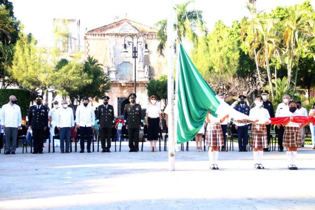 En representación del gobernador Mauricio Vila Dosal y con el apoyo de la escolta conformada por alumnas de la escuela primaria Manuel Sarrado de la Alianza de Camioneros, Fritz Sierra izó el Lábaro Patrio en la asta ubicada en la Plaza Grande de esta capital, ante estudiantes de diversos planteles escolares, docentes, funcionarios de los tres niveles de gobierno y público en general.