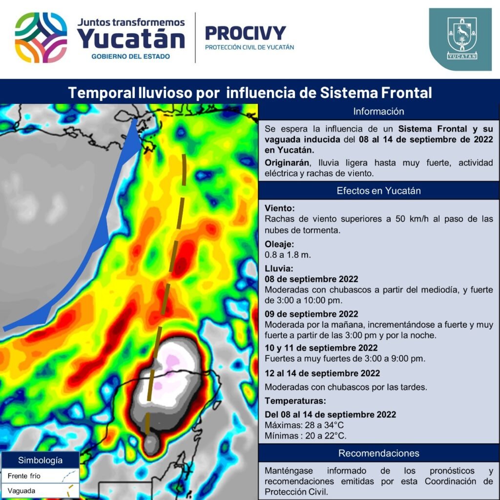 A partir del jueves 8 de septiembre, la influencia del sistema frontal originará lluvia moderada a partir del mediodía en el noroeste del estado, incrementándose a fuerte desde las 3:00 de la tarde y hasta las 10:00 de la noche de manera generalizada prácticamente en todo Yucatán.