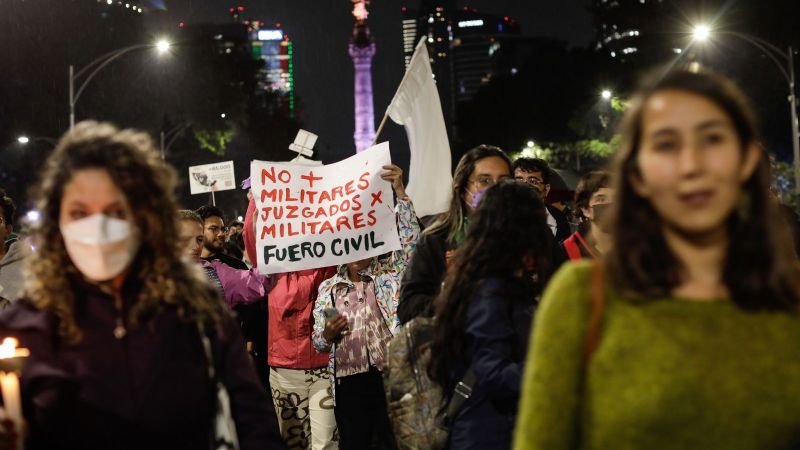 Pese a la lluvia, los manifestantes se concentraron en la glorieta de la Victoria Alada y, alrededor de las 20 horas, comenzaron su marcha pacífica al grito unísono de “¡No más guerra! ¡No más guerra!” y una gran manta morada que decía “Nos faltan 24 mil. ¡Vivas se las llevaron, vivas las queremos!”.