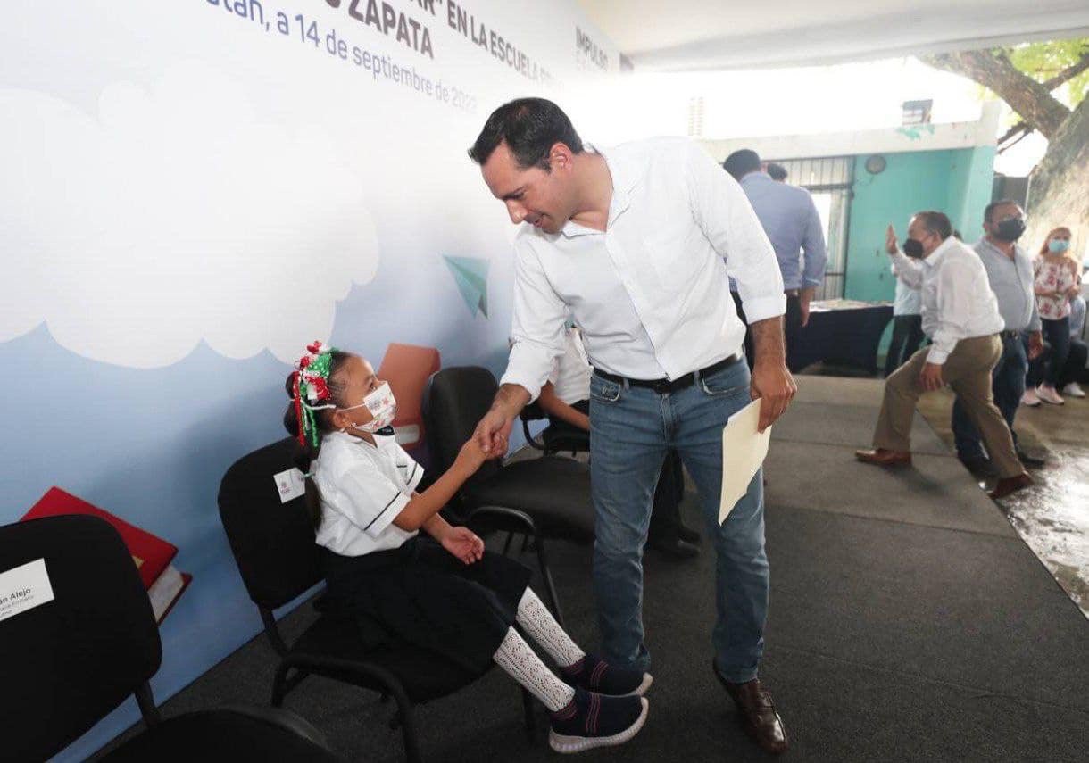 Vila Dosal recorrió las escuelas primarias “Ana María de los Ángeles Piña Azcorra” y «Emiliano Zapata», ubicadas al sur de la ciudad, donde siguió con la distribución de estos apoyos que benefician a los 1,200 alumnos de los turnos matutino y vespertino de ambos planteles y que además respaldan la economía de las familias con un ahorro de 2,850 pesos por cada estudiante para los padres y madres de familia.