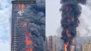 Las impresionantes imágenes difundidas por la televisión estatal CCTV mostraban llamas inmensas de color naranja arrasando todo un costado del edificio, que tiene 42 plantas en la superficie.