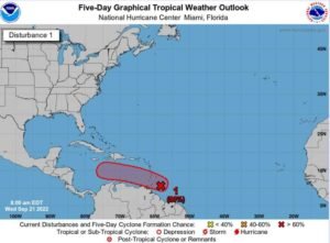 De la misma forma, el Centro Nacional de Huracanes, con sede en Miami, Florida, alertó sobre disturbio ubicado en el área invest 98L al norte de Isla Margatita en Venezuela, con derrotero nor-noreste y que entraría a la cuenca del Caribe en las próximas horas con fuerzas y vientos que van tomando intensidad y alta probabilidad de convertirse en una depresión intensa.