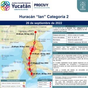 Convertido ya en huracán categoría 2, “Ian” mantiene su trayectoria noroeste con velocidad de desplazamiento de 20 km/h, por lo que en el transcurso de las próximas horas afectaría la punta oeste de Cuba con efectos de nubosidad y humedad hacia la península de Yucatán.