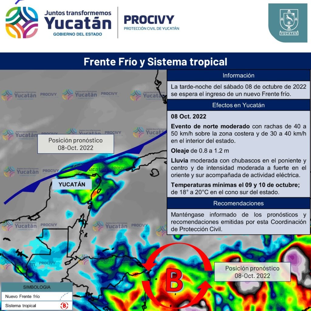 Mérida, Yuc 5 de oct.- La Coordinación Estatal de Protección Civil (Procivy) informó del ingreso, este sábado 8, de un frente frío que provocaría norte con rachas de viento, en la costa, y lluvias, en el oriente y sur de Yucatán, acompañadas de actividad eléctrica, que posteriormente, interactuará con un sistema tropical, lo cual mantendrá el potencial de lluvias durante este fin de semana.