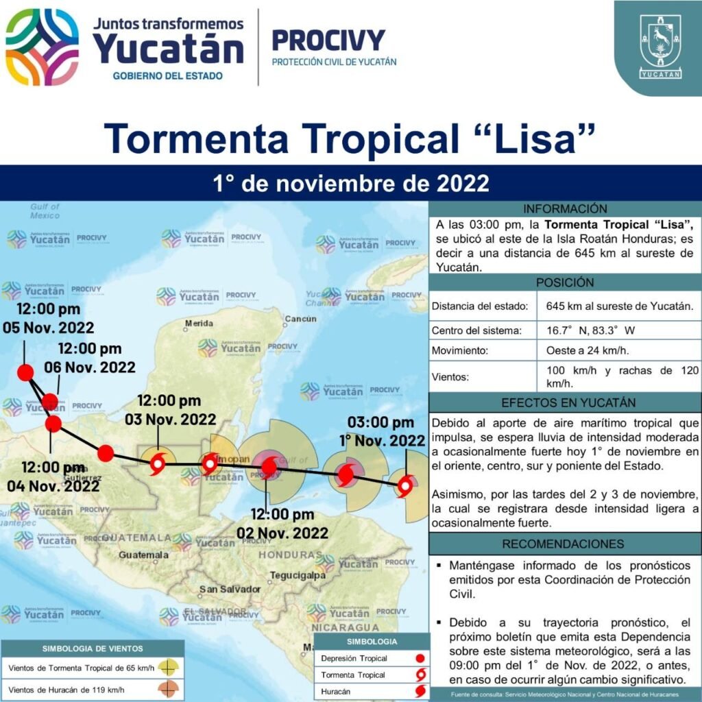 Mérida, Yuc 1 de nov.- Como medida informativa y preventiva, ante el avance en Centroamérica de la tormenta tropical Lisa, la Coordinación Estatal de Protección Civil (Procivy) informó que el Sistema Nacional de Protección Civil (Sinaproc) ha puesto la alerta azul para municipios del sur.