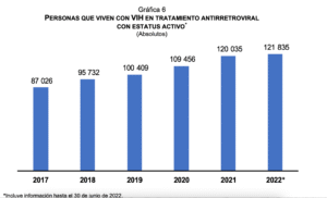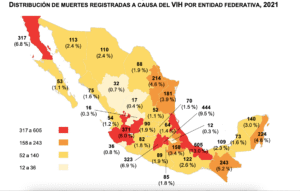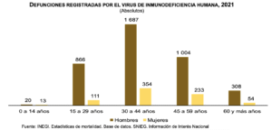 En cifras del Inegi, en 2021, en México se registraron 4 mil 662 muertes relacionadas con el virus de inmunodeficiencia humana (VIH); 83.6 por ciento, esto es 3 mil 896 fueron casos personas de sexo masculino y 16.4 por ciento, esto es, 766, de sexo femenino. La tasa de mortalidad por enfermedades relacionadas con el VIH fue de 3.7 fallecimientos por cada 100 mil personas.