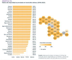 De esta forma, los estados con mayores índices de impunidad acumulada en homicidio doloso fueron Oaxaca, 100 por ciento, Morelos, 99.8; Tlaxcala, 99.5; Colima, 99.3 y Guerrero, 98.5 por ciento. De esta forma, los estados con menores índices de impunidad acumulada en homicidio doloso fueron Yucatán, 38.5; Aguascalientes, 58.1; Querétaro, 69 por ciento, la capital del país, 69.6 y Coahuila, 70.9 por ciento.