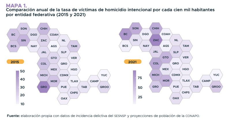 Durante 2021, los estados con mayores tasas de víctimas de homicidios intencionales registradas por cada cien mil habitantes fueron Zacatecas, 97.6; Baja California, 82.5; Colima, 65.7; Chihuahua, 64.6 y Sonora, 63.4 por ciento. En este renglón, Yucatán ocupa el último sitio en crímenes dolosos con 1.34 por cada 100 mil habitantes, 11 veces menor a la tasa nacional que es del 15.15 casos por cada 100 mil habitantes.