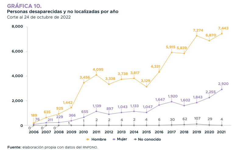 De acuerdo con los datos del Sesnsp, en 2021, un total de 10 mil 363 personas fueron reportadas como desaparecidas, 7 mil 443 hombres y 2 mil 920 mujeres, primordialmente en 16 estados del país y que no se incluyen en las cifras de homicidios, hasta no hallar y certificar su posible deceso.