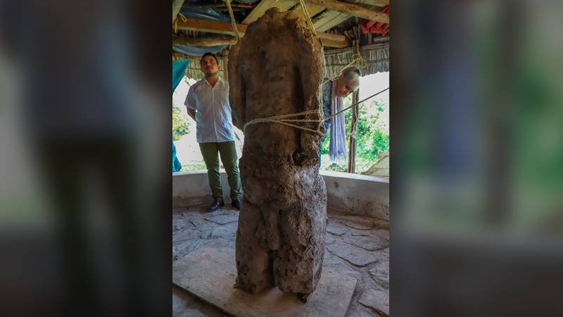 La figura humana tallada en piedra caliza mide 1.68 metros y no cuenta con cabeza, “lo que representa seguramente a un guerrero que fue prisionero en combate y está ofrendada a las estructuras de esta zona arqueológica que es Oxkintok, Yucatán, que forma parte de la Ruta Puuc, ya en los límites con el estado de Campeche”, detalló el director general del instituto, Diego Prieto.