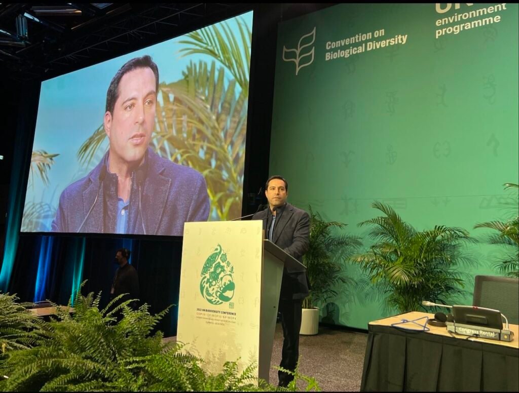 Montreal, Ca, 13 de dic.- Con un llamado para actuar juntos y de forma inmediata para proteger el medio ambiente y preservar las reservas naturales del planeta, el Gobernador Mauricio Vila Dosal inició su participación en la COP15 del Convenio de las Naciones Unidas sobre la Diversidad Biológica, que se celebra del 7 al 19 de diciembre, en Montreal, Canadá, exponiendo las acciones que está implementando Yucatán en esta materia, así como buscar financiamiento para impulsar proyectos que protejan la biodiversidad del estado.