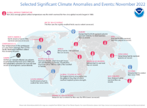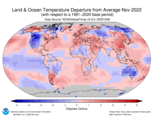 A nivel mundial, noviembre de 2022 fue el noveno noviembre más cálido en el registro de la NOAA de 143 años. La temperatura superficial global del año hasta la fecha (enero-noviembre) fue la sexta más cálida registrada.