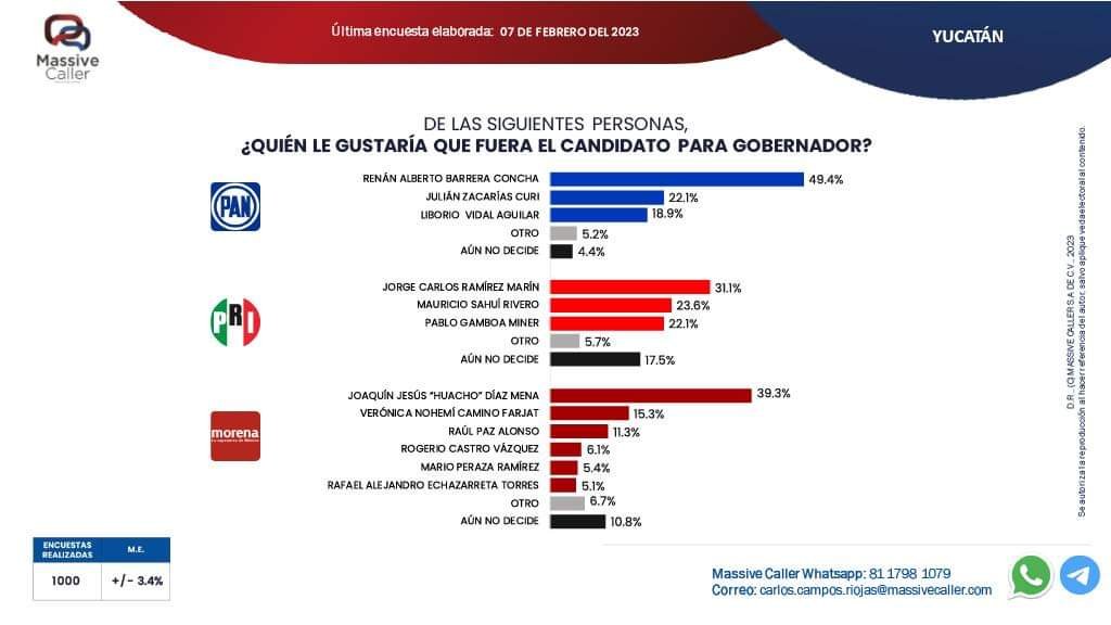Masive Caller, publicó esta semana una medición realizada en el estado con cifras importantes del 39 por ciento de la preferencia para el Partido Acción Nacional (PAN), en tanto que, Renán Barrera sobre otros dos competidores que también han manifestado abiertamente sus deseos de contender por la gobernatura de Yucatán.