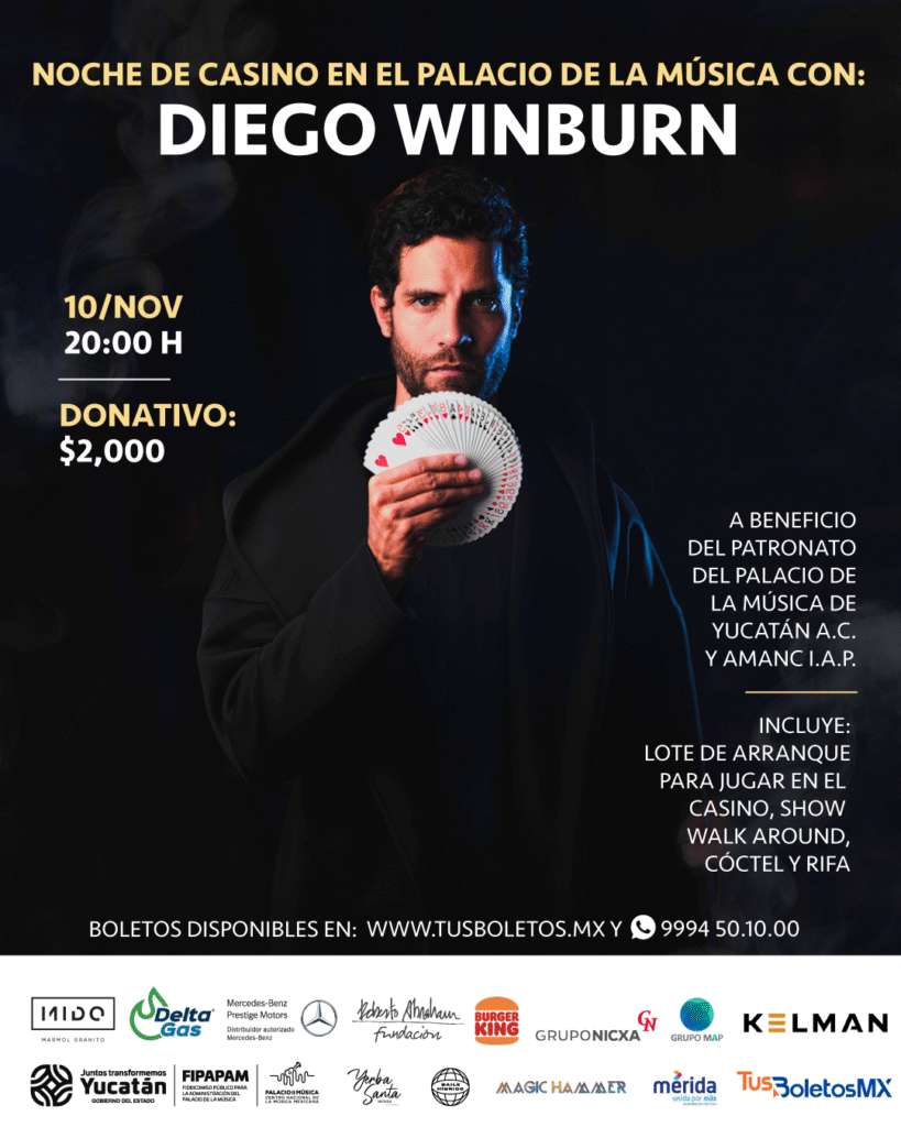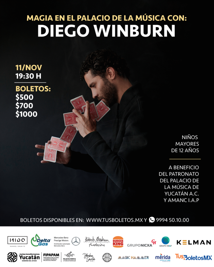 El segundo evento nombrado, «Espectáculo de Ilusionismo con Diego Winburn», tendrá lugar el 11 de noviembre a las 19:30 horas en el auditorio del Palacio de la Música, donde Diego Winburn deslumbrará a una audiencia de 450 personas. Los boletos-donativos tendrán un costo de $500, $700 y $1,000. Las entradas para ambos eventos están disponibles a través de tusboletos.mx.