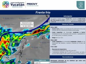 El Procivy informó que, el frente frío se dejará sentir en la mañana del domingo con lluvias moderadas a fuertes y posterior descenso de temperatura. Conforme a datos del Sistema Estatal de Monitoreo y Alertamiento de Procivy y el Servicio Meteorológico Nacional de la Comisión Nacional del Agua, el sistema frontal ingresará al país el viernes y durante el fin de semana recorrerá el oriente y sureste del territorio nacional así como el norte de la Península de Yucatán.