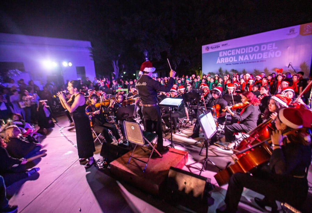 Mérida, Yucatán a 7 de diciembre de 2023.- Para enmarcar el inicio de las fiestas navideñas, el Centro Estatal de Bellas Artes presentó un programa artístico en el que los estudiantes de teatro, música y danza, mostraron su talento mediante la escenificación de la obra de teatro “Un cuento de Navidad”, que sirvió de preámbulo para el encendido del árbol navideño.