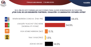 La encuesta de la segunda semana de abril indica que, el candidato Renán Barrera Concha mantiene un 44,4 por ciento de la votación contra 34,9 que recibe su contendiente más cercano el candidato de la alianza “Sigamos Haciendo Historia” Joaquín Díaz Mena que mantiene el 30 por ciento de la simpatía, según las cifras de esta empresa.