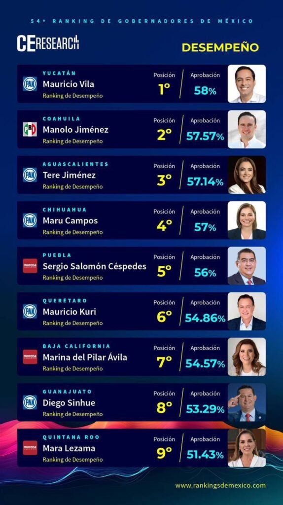 Vila Dosal ocupó el primer lugar del ranking con una aprobación muy por encima de los otros Gobernadores, resultado de su gran labor realizada en el ámbito de la economía, la seguridad, el turismo, los servicios y la atención a la ciudadanía.