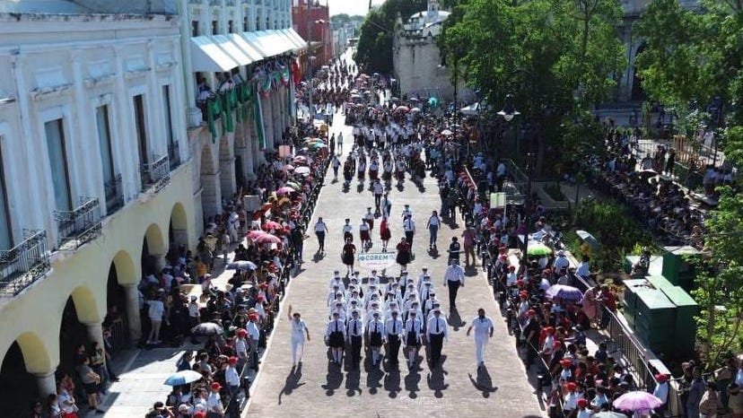 Posteriormente, arrancó el desfile de los contingentes escolares, donde participaron instituciones educativas emblemáticas de la capital yucateca, tales como la Universidad Autónoma de Yucatán (UADY) y la Escuela Secundaria Estatal número 1 «Agustín Vadillo Cicero».