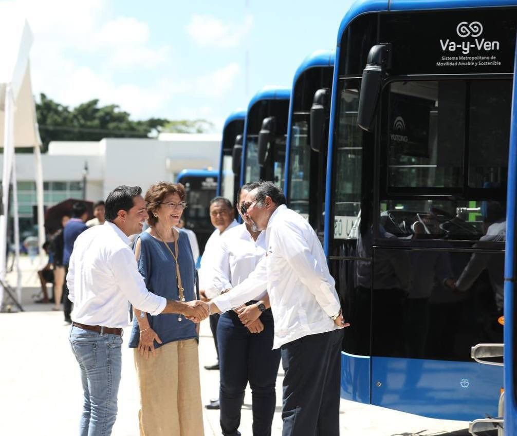Acompañada del senador Mauricio Vila Dosal, Fritz Sierra supervisó las nuevas unidades con las que se llegará a tener un total de 740 unidades, presentando cerca del 80% de avance. Estos nuevos autobuses brindarán servicio próximamente en las rutas Gálvez-Villas de Oriente R1; Gálvez-Villas de Oriente R2, R-106 69 Opichén; Av. Alemán-Campus UADY R1 y Coca-Amalia-San Pedro Noh Pat-Encinos II.
