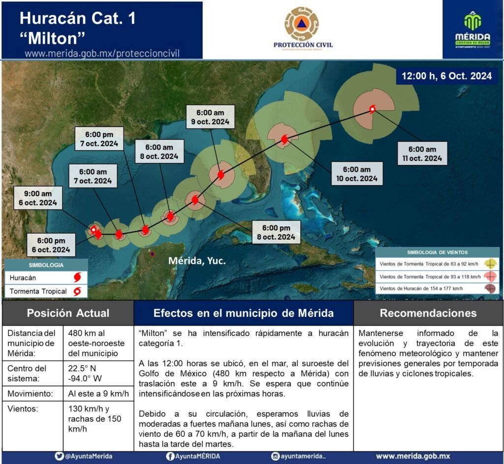 Mérida, Yuc 6 de oct.- Ante la presencia del Huracán “Milton” de categoría 1 en el Golfo de México y su desplazamiento hacia el este, así como la alerta verde generada por el Sistema Nacional de Protección Civil, el Ayuntamiento de Mérida, a través de la coordinación municipal de Protección Civil mantiene en estrecha vigilancia este fenómeno meteorológico y monitoreo permanente de los pronósticos, en estrecha coordinación con la Comisión Nacional del Agua. Así lo confirmó el coordinador municipal de protección civil, Jesús Enrique Alcocer Basto.